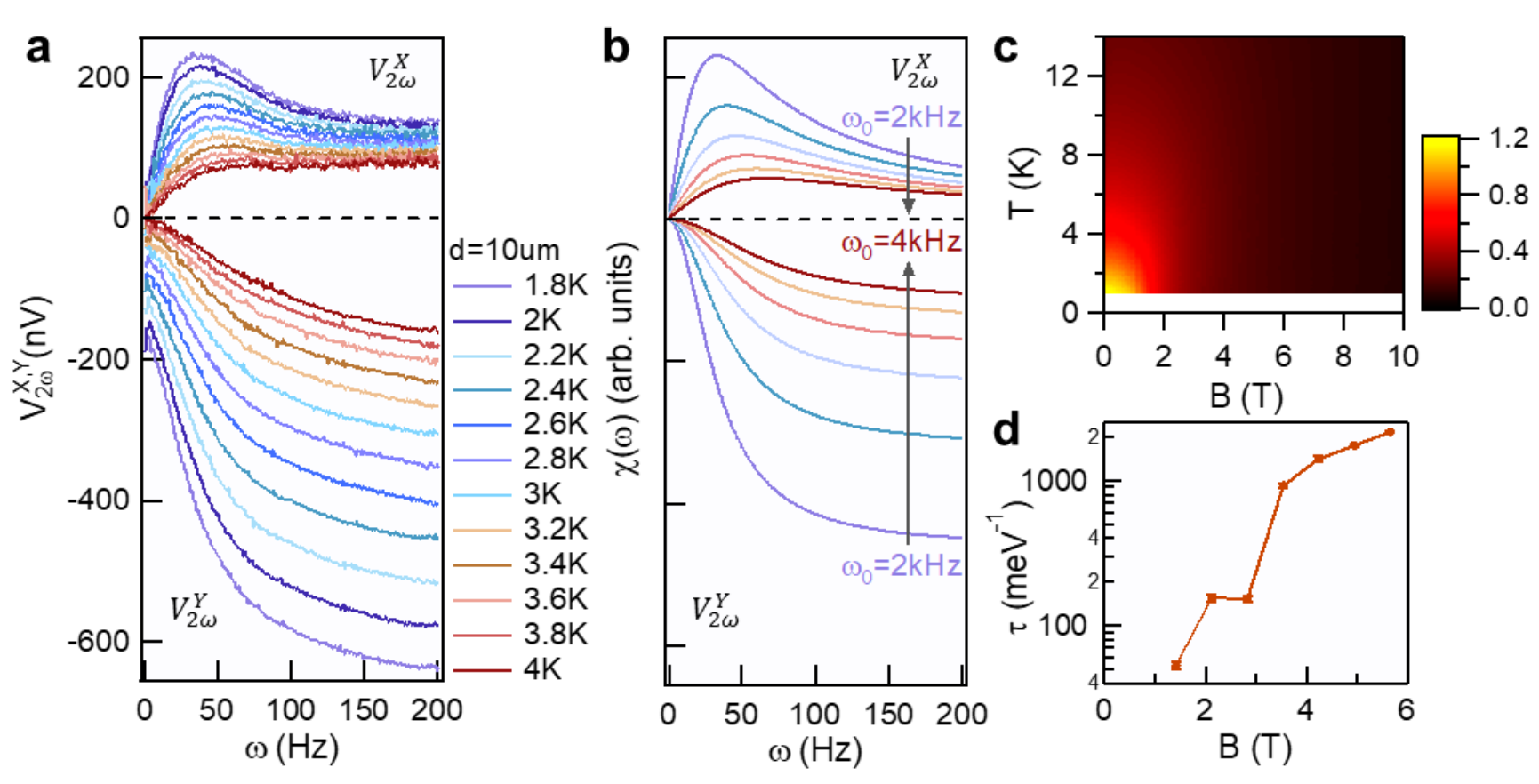 图3. (a)不同温度下V2ωX和V2ωY随激发频率的变化图。(b)过阻尼受迫振子响应的实部和虚部的理论模拟。(c) 蒙特卡罗计算磁化率的B-T相图。(d) 2K温度下蒙特卡罗模拟磁振子寿命随磁场的变化。